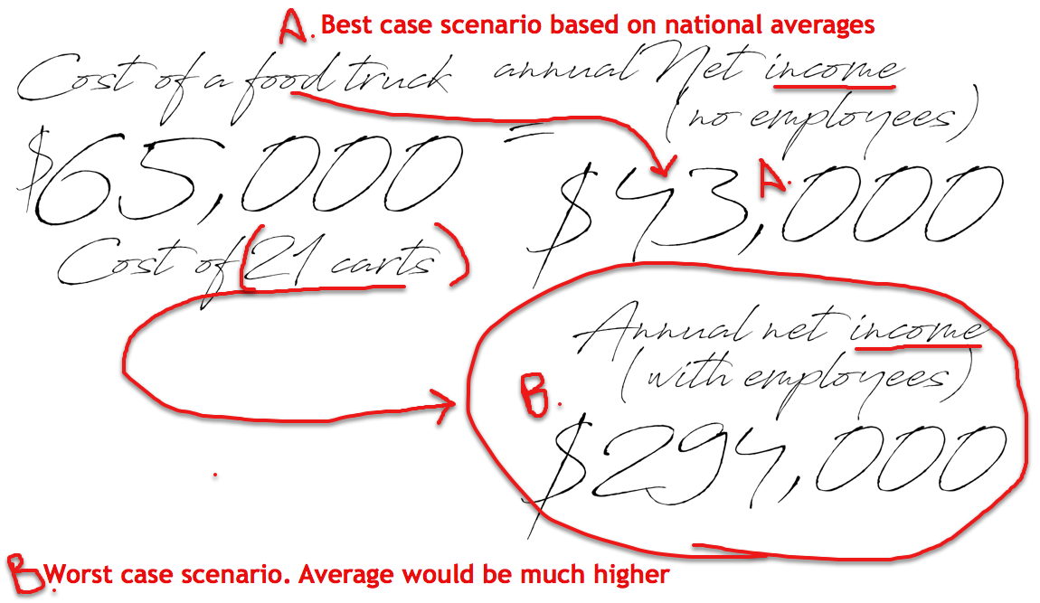 If you want a food truck, just must have one… start first with a cart or trailer and let it pay for your food truck. Using real bonafide… DEMONSTRABLE numbers, I’ve proven you can, even in the worst case scenario, make 7 x the income with carts compared to best case scenario averages of food truck owner incomes.