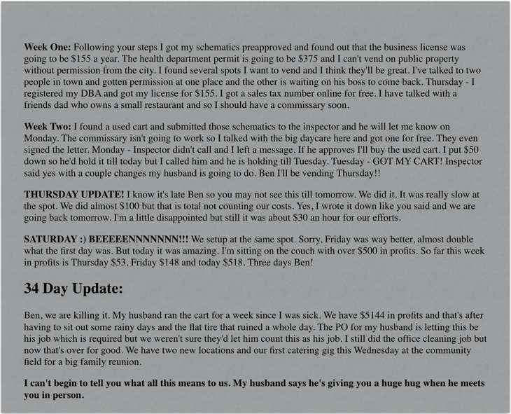 “Ben, I couldn’t put it down. I knew this was going to take me out of the as you say, ‘eleventy-seven’ jobs I was doing to make ends meet. I’m going to start a hot dog stand business!”