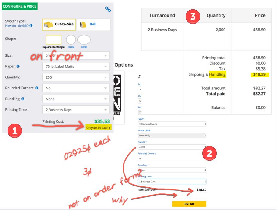 I changed the quantity to 2000 from 250 and my price per sticker decreased to approx. 3¢ each. (not bad at all) Then I went on to the checkout screen and notice (image 3 above) – they have charged shipping AND HANDLING.