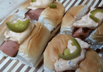 I don’t have time to toast from a hot dog cart usually so steaming these little suckers is about a 35 second job using my rapid steam method. I use normal dinner rolls or those Hawaiian sweet rolls. Slice the top open in the middle and lay that little weenie right in. Top with a dollop of my Sinful sauce and you’re in business. You can garnish as I did with some pieces of jalapeños or a sprinkling of cayenne pepper.