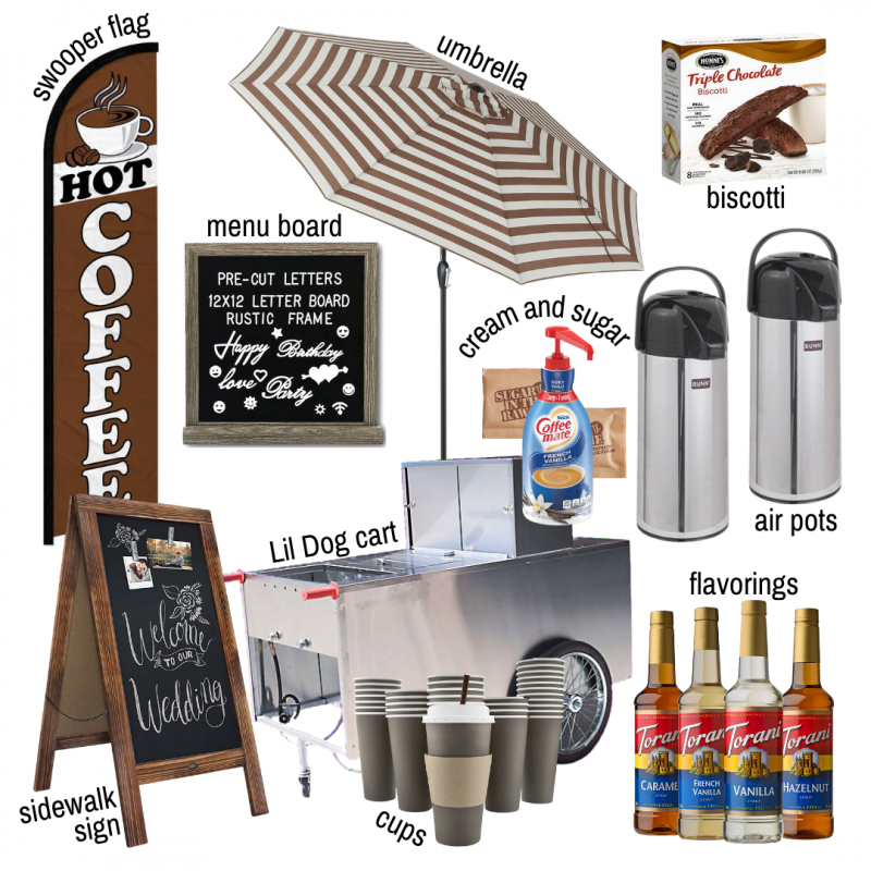 Here are some coffee cart ideas to help you get started. As an example, check out my idea board showing the Lil Dog with the basics that would take it from serving hot dogs to a mobile café.