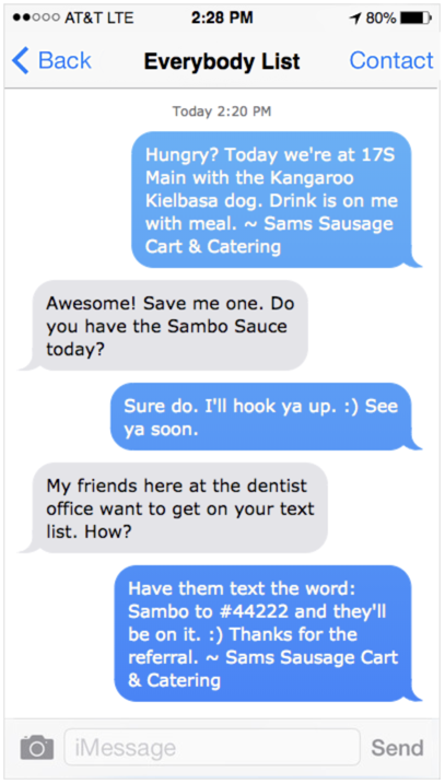 It would take a full-time staff of professionals to keep up with the changes in rules, algorithms (computer nerd type word for artificial intelligence), ad platforms and compliance rules with social media. It’s why many street food pros, hot dog vendors to kettle corn vendors are turning to sms text marketing.