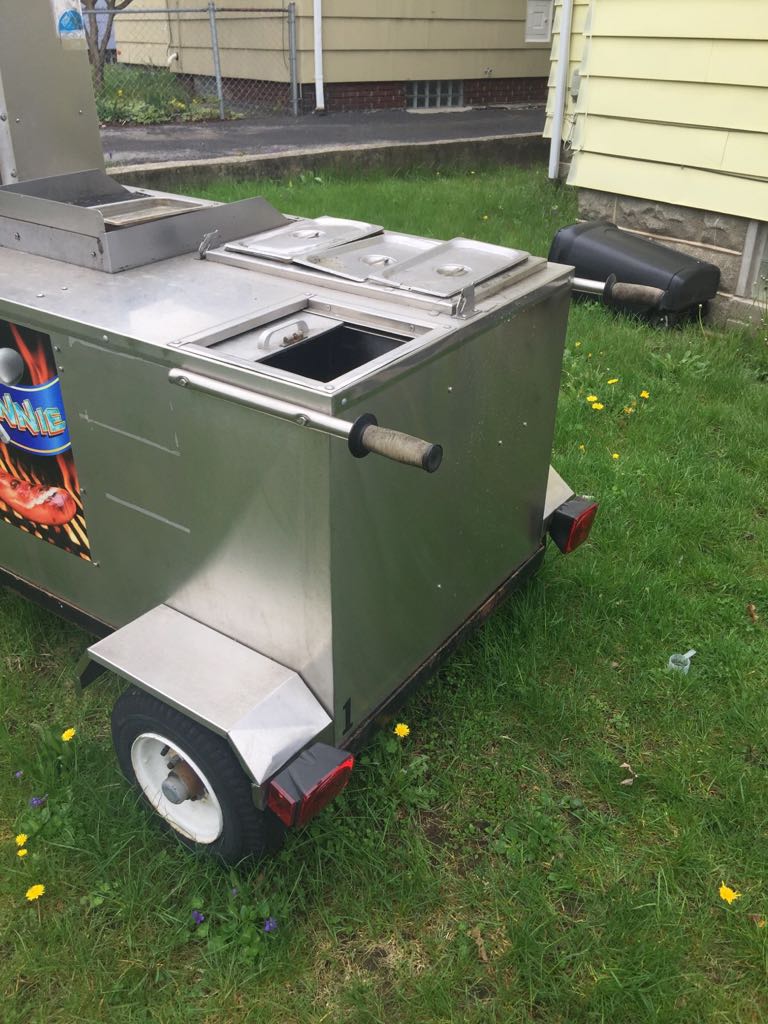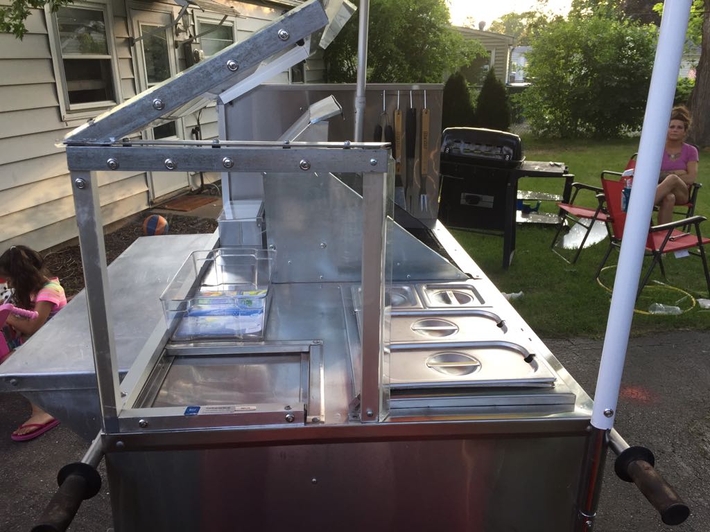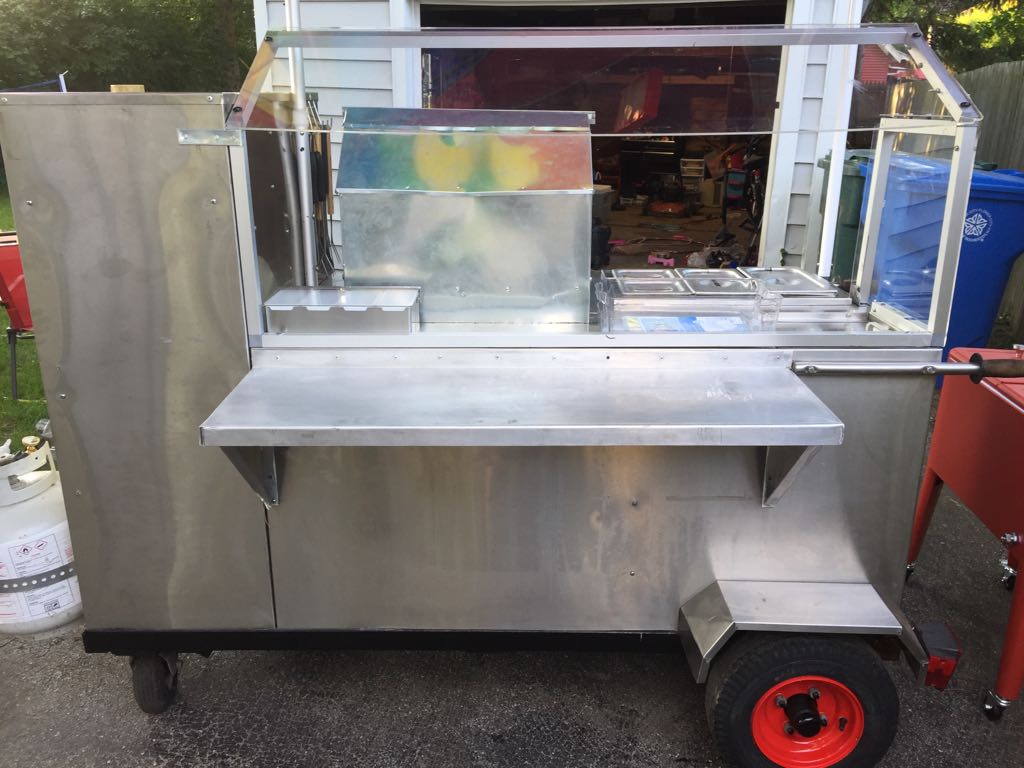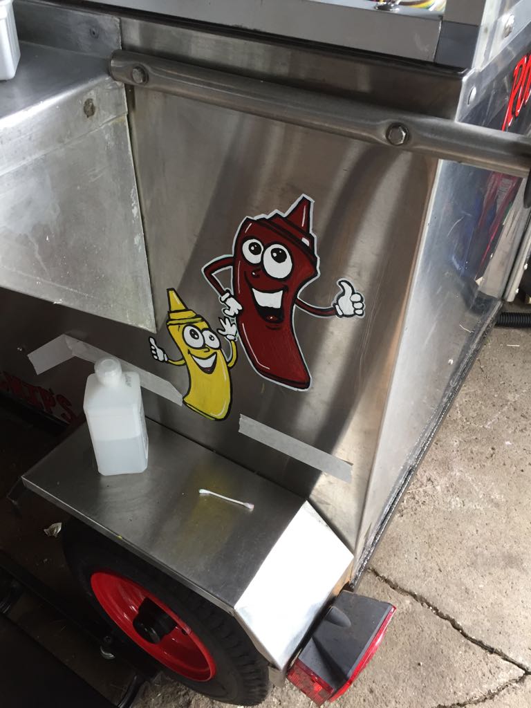 After much hard work scrubbing and scraping, after fabricating required covers, after adding surround for grill, the cart went from an old has been to a sexy beast called Roc It Dogs. [click images to make larger]