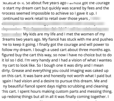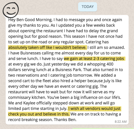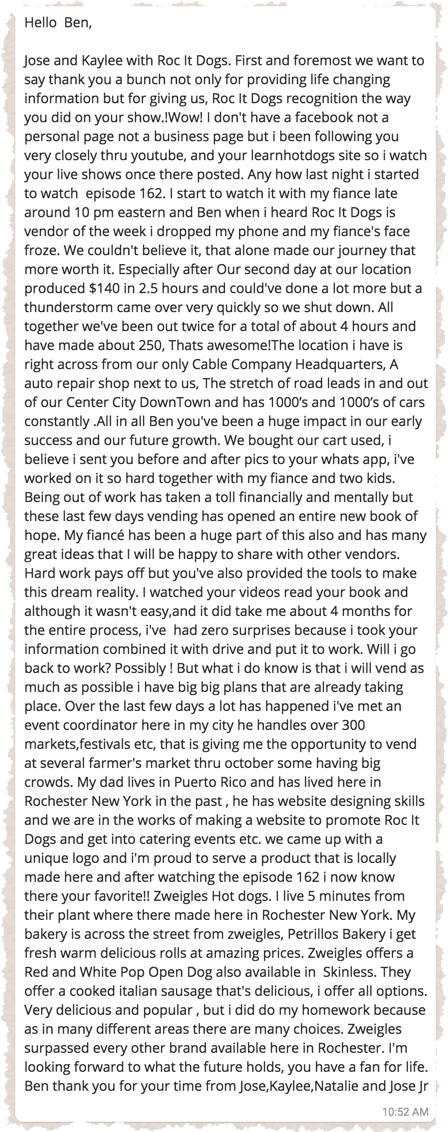 “I been out of work since 6/18 of this year issues with my wrist. Over that time being out of work I finished up the cart as that was my life line and only hope of income. We finally got it going and completed the licensing aspects of it and on 8/2 we went live. On 8/13 I purchased a deep freezer to store my dogs meats etc. my garage floods in the rain and my freezer was sitting in the water so I went to put it on bricks to avoid any damage and bam right wrist gave out freezer slammed on both hands. Right hand was like a bomb went off inside had surgery on the 25th, I now have 4 pins in my right hand on top of a cast. The left hand also had a fracture so that’s how I ended up with both hands casted. Last Thursday I had the left hand out the cast but it’s been a painful experience getting it to work for me since I am right handed and have no grip strength in my left hand. But all in all Ben I’ve kept pushing vending has given me hope and kept me positive. My fiancé has been amazing learning the business and applying all I’ve learned from you to make this business work every time we go to vend. I went out yesterday to my market first time by myself and with only my left hand managed to make 200 bucks from 10-1. I can’t really complain I’ve been blessed and I see no end in sight. I have two kids and my fiancé being the only income vending has helped us big time. Thanks for the reply it means so much.” – Jose